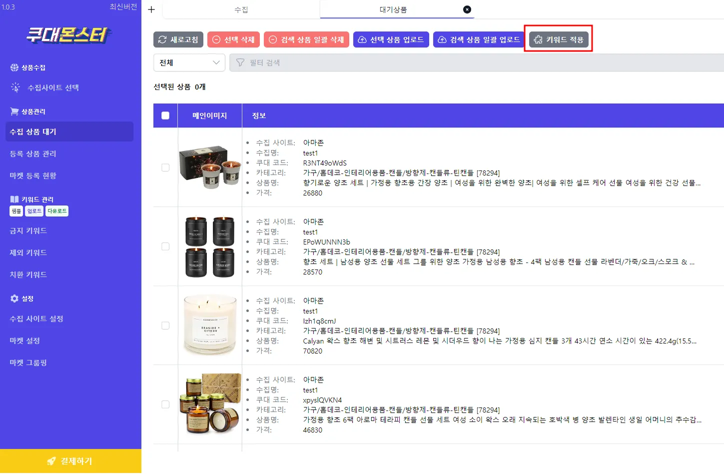 키워드관리 → 키워드 추가(치환키워드) → 상품 선택 → 키워드 적용